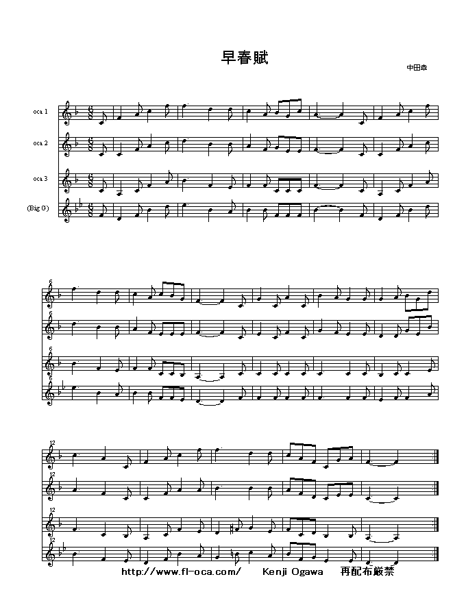 この楽譜は同種のオカリーナ三本、又は C管2本とG大一本 で演奏出来る様にアレンジしてあります。