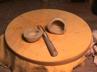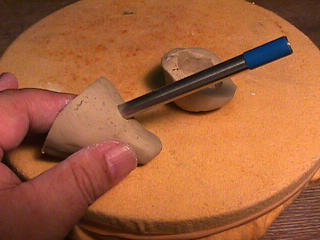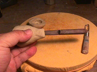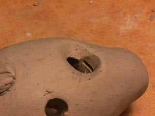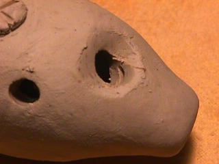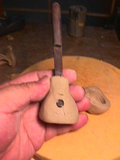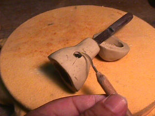 The sound hole has been opened. Insert the boxwood spatula again to finish the air way.