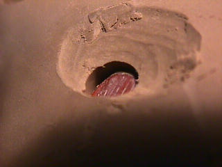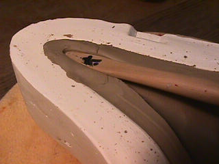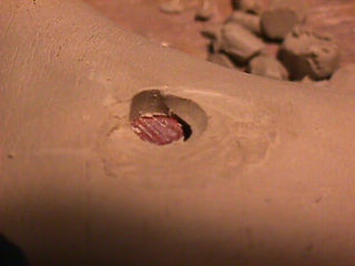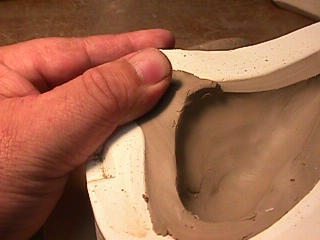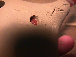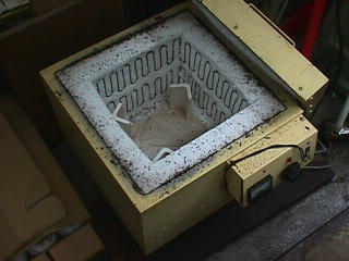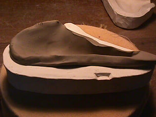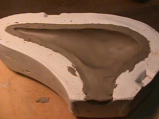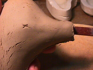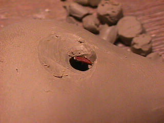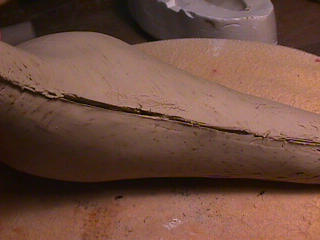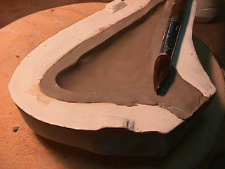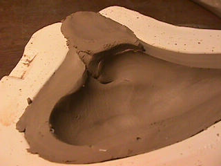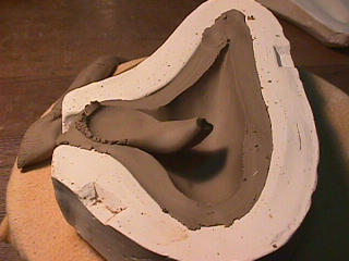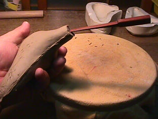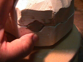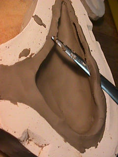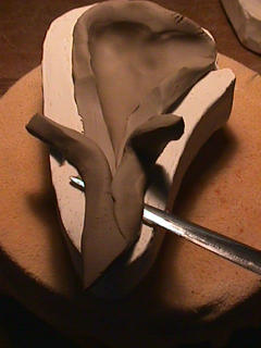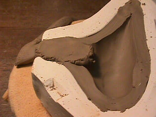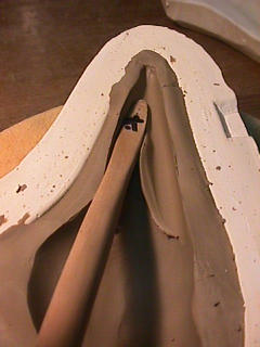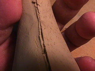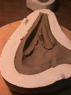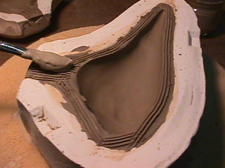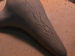 ある日の工房を見学すると・・ (むかし、公開していたものです) 型を使っての作り方 オカリーナを作るには色々な方法がありますが、 ある日の「お」カリーナ工房を見学してその一つの方法を見ましょう。 (現在の作り方とは違う所が有ります) お茶碗を作るのに色々な方法で作ることが出来るのと同じで色々な作り方が考えられます。 ここでは、大量に作る作り方や安易な作り方による方法は採りません。 なぜなら、工業的に作るオカリーナには興味がないからです。 それは製品のバラツキから言えば安定しているかも知れませんが、 それだけ作者のセンスによる良い物が出来る可能性も無くなる事を意味します。 いわゆる手作りの良さを生かしたオカリーナ作りです・・。 型を使うことについてはもうご存じでしょうが、 量産のためでなく音程をコントロールする為なのです。 この事が理解出来ないのなら、 フルートオカリーナ館のオカリーナの部屋を良く読んでこちらにお越し下さい。 あれば便利な設備 灯油の窯です、オカリーナを作るには此ぐらいの大きさで十分です。 電気窯です。最大20個ぐらい焼けます。 電気窯で黒陶にすると(スーディングと言う現象、炭素に依り内部で絶縁が出来なくなる) ヒーター線断線の原因に成る事が有ります。 流し台 オカリーナを乾燥させる棚 日陰で乾燥させます。乾燥速度が意外に重要です。(いっぱい溜まるとうれしい) 手ろくろ(無ければ新聞紙で代用・・古代では木の葉を使用) 作り方 これから出るであろう音を想像しながら、一個ずつ丁寧に心を込めて作ります。 ここでは粘土に空気が入っている場合の空気抜きの仕方(ナイフ等で空気を逃がす) サイドの木はタタラ板と言って粘土の厚みを決めます。(この様な形に延ばし型に合わせて切る) 型の上に乗せる 型の作り方に付いて解らない人は、オカリーナ情報のテキストを参照して下さい。 粘土を曲げ型に入れる 細かい部分を石膏面に接着させる(上から強く押さえつける) 余分な粘土の切り取り この場合のナイフは刃のない部分をせこう型に押しつける様にしながら粘土を切ると良い。 先端部分の空間をヘラを利用して確保(ヘラは型に合わせて自分で作る) ヘラはサイドのラインに合わせ動かす(粘土の厚さ) (サイドのラインに従い管厚を決める) エアーウエイ部分の粘土の付け足し方法 付け足した粘土は表面に出ないように中から押すと良い 内側上部のラインを決める 余った粘土は吹き込み口の方に親指で押す 上記の作業をしながら内部上方のラインを決める 余った粘土は切り取る サイドの余った粘土の切り取り 内部の仕上げ 接着面に水分を補給する 爪楊枝で作った櫛で接着面を傷つける ドベを刷毛で塗る ドベ塗り終了 上下の型を合わせ吹き込み口を押し接着をする 型から取り出した接着部分(指で軽く押す) 型から取り出した粘土の表面(仕上げの時までそのままにしておく) 粘土の柔らかさによってヒビの状態が変わります エアーウエイ用のヘラを差す(角度に注意) ヘラの先端部分を印しをつける ここで、半日ぐらい作品を乾燥させます。 この先の作業は粘土が少し堅い方が作業がしやすいのです。 バリを綺麗にする。 ここで使用しているナイフはペーパーナイフを加工した物です。 ポンスでトーンホールを開ける エアーウエイを開けるときに使用するヘラ、細い物と仕上げ用 粘土の堅さに依るが細いヘラを使う前にナイフで開けるときもある。 細目のヘラを入れる 吹き出し口の上部の粘土がめくれている ヘラによる吹き出し口の崩れ 吹き出し口の崩れの修正 4mmのポンスで修正したところ ヘラを抜いた所 仕上げ用のヘラを入れた所 吹き出し口上部の仕上げ 少しずつ削る エッジのラインまで削る 角度の調整 歌口と吹き出し口とエッジの下部 この後エッジの下部を削り歌口の成形を終了する 脇の仕上げ 調律後、表面の仕上げを行う 表面の仕上げ後トーンホールに出来たバリをきれいにする 仕上げをした物(左)仕上げ前(右) この後少し乾燥させ、調律をしてから本乾燥に入る 堅くなった粘土の再生法です。 少し堅いぐらいの粘土は切り糸などで、薄く切り・・ タッパウエアーやビニールの中で、濡れたタオルに包み柔らかくし練り直す。 焼成中 焼き上がり。 中中央の白い棒は熱伝対温度計。素焼きなので作品は重ねても大丈夫です。 温度計です(古いのですが好きなんですよね) 黒陶にする さやの蓋を開けたところ 一番ドキドキする時です。 お弟子さんの処女作品も綺麗に仕上がりました。 水洗いをしました・・・ さて、これから最終調整です。 お弟子さんのてびねりの処女作品。ちゃんとC管に成っていて、しかも全部の音が出ました。 黒陶にした作品・・・お弟子さんのもの 手伝ってあげましたが・・・これも処女作品です 日本橋三越の生徒さんの作品 オカリーナを作るための方法は他にも沢山あります。 簡単に作る方法を考え過ぎると問題にぶつかりますが、 そんな時は「作っているのは何で