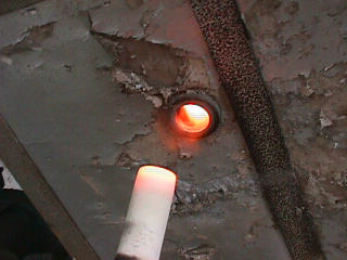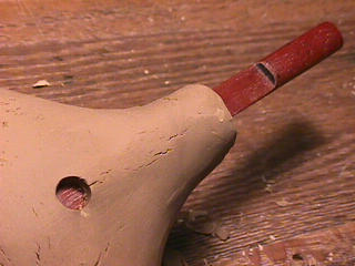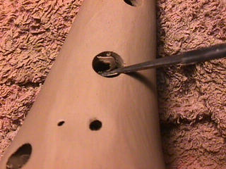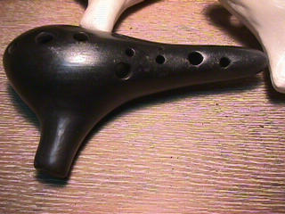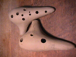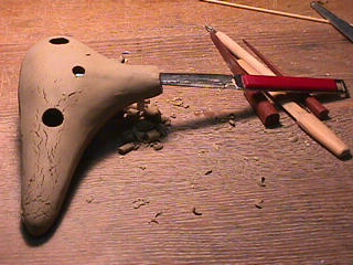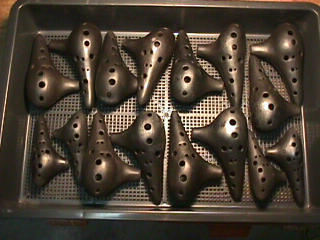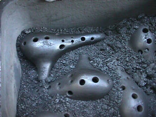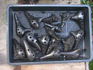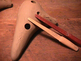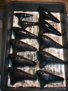 オカリーナを作るには色々な方法がありますが、 ある日の「お」カリーナ工房を見学してその一つの方法を見ましょう。 (現在の作り方とは違う所が有ります) お茶碗を作るのに色々な方法で作ることが出来るのと同じで色々な作り方が考えられます。 ここでは、大量に作る作り方や安易な作り方による方法は採りません。 なぜなら、工業的に作るオカリーナには興味がないからです。 それは製品のバラツキから言えば安定しているかも知れませんが、 それだけ作者のセンスによる良い物が出来る可能性も無くなる事を意味します。 いわゆる手作りの良さを生かしたオカリーナ作りです・・。 型を使うことについてはもうご存じでしょうが、 量産のためでなく音程をコントロールする為なのです。 この事が理解出来ないのなら、 フルートオカリーナ館のオカリーナの部屋を良く読んでこちらにお越し下さい。 あれば便利な設備 灯油の窯です、オカリーナを作るには此ぐらいの大きさで十分です。 電気窯です。最大20個ぐらい焼けます。 電気窯で黒陶にすると(スーディングと言う現象、炭素に依り内部で絶縁が出来なくなる) ヒーター線断線の原因に成る事が有ります。 流し台 オカリーナを乾燥させる棚 日陰で乾燥させます。乾燥速度が意外に重要です。(いっぱい溜まるとうれしい) 手ろくろ(無ければ新聞紙で代用・・古代では木の葉を使用) 作り方 これから出るであろう音を想像しながら、一個ずつ丁寧に心を込めて作ります。 ここでは粘土に空気が入っている場合の空気抜きの仕方(ナイフ等で空気を逃がす) サイドの木はタタラ板と言って粘土の厚みを決めます。(この様な形に延ばし型に合わせて切る) 型の上に乗せる 型の作り方に付いて解らない人は、オカリーナ情報のテキストを参照して下さい。 粘土を曲げ型に入れる 細かい部分を石膏面に接着させる(上から強く押さえつける) 余分な粘土の切り取り この場合のナイフは刃のない部分をせこう型に押しつける様にしながら粘土を切ると良い。 先端部分の空間をヘラを利用して確保(ヘラは型に合わせて自分で作る) ヘラはサイドのラインに合わせ動かす(粘土の厚さ) (サイドのラインに従い管厚を決める) エアーウエイ部分の粘土の付け足し方法 付け足した粘土は表面に出ないように中から押すと良い 内側上部のラインを決める 余った粘土は吹き込み口の方に親指で押す 上記の作業をしながら内部上方のラインを決める 余った粘土は切り取る サイドの余った粘土の切り取り 内部の仕上げ 接着面に水分を補給する 爪楊枝で作った櫛で接着面を傷つける ドベを刷毛で塗る ドベ塗り終了 上下の型を合わせ吹き込み口を押し接着をする 型から取り出した接着部分(指で軽く押す) 型から取り出した粘土の表面(仕上げの時までそのままにしておく) 粘土の柔らかさによってヒビの状態が変わります エアーウエイ用のヘラを差す(角度に注意) ヘラの先端部分を印しをつける ここで、半日ぐらい作品を乾燥させます。 この先の作業は粘土が少し堅い方が作業がしやすいのです。 バリを綺麗にする。 ここで使用しているナイフはペーパーナイフを加工した物です。 ポンスでトーンホールを開ける エアーウエイを開けるときに使用するヘラ、細い物と仕上げ用 粘土の堅さに依るが細いヘラを使う前にナイフで開けるときもある。 細目のヘラを入れる 吹き出し口の上部の粘土がめくれている ヘラによる吹き出し口の崩れ 吹き出し口の崩れの修正 4mmのポンスで修正したところ ヘラを抜いた所 仕上げ用のヘラを入れた所 吹き出し口上部の仕上げ 少しずつ削る エッジのラインまで削る 角度の調整 歌口と吹き出し口とエッジの下部 この後エッジの下部を削り歌口の成形を終了する 脇の仕上げ 調律後、表面の仕上げを行う 表面の仕上げ後トーンホールに出来たバリをきれいにする 仕上げをした物(左)仕上げ前(右) この後少し乾燥させ、調律をしてから本乾燥に入る 堅くなった粘土の再生法です。 少し堅いぐらいの粘土は切り糸などで、薄く切り・・ タッパウエアーやビニールの中で、濡れたタオルに包み柔らかくし練り直す。 焼成中 焼き上がり。 中中央の白い棒は熱伝対温度計。素焼きなので作品は重ねても大丈夫です。 温度計です(古いのですが好きなんですよね) 黒陶にする さやの蓋を開けたところ 一番ドキドキする時です。 お弟子さんの処女作品も綺麗に仕上がりました。 水洗いをしました・・・ さて、これから最終調整です。 お弟子さんのてびねりの処女作品。ちゃんとC管に成っていて、しかも全部の音が出ました。 黒陶にした作品・・・お弟子さんのもの 手伝ってあげましたが・・・これも処女作品です 日本橋三越の生徒さんの作品 オカリーナを作るための方法は他にも沢山あります。 簡単に作る方法を考え過ぎると問題にぶつかりますが、 そんな時は「作っているのは何で何の為に作っているのか」を思い出すことです。 そうすれば答えは出てくるでしょう
